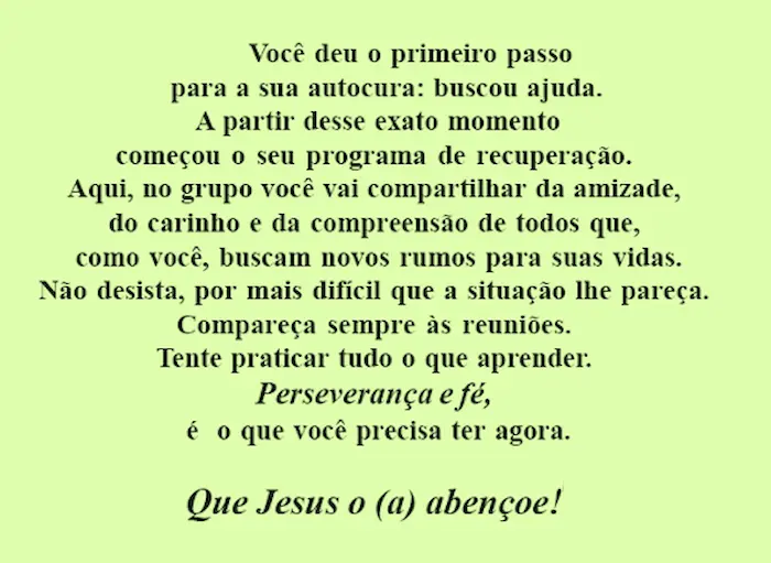 No nosso programa não falamos dos vícios e nem das drogas, falamos da cura, do nosso progresso individual e coisas assim. Para nós, não interessa em que tipo de drogas ou comportamentos nos viciamos. Interessa-nos somente a cura, a libertação.